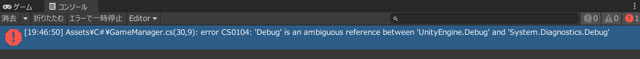 このようなエラーが出た場合、Debugが「UnityEngine.Vector2」と「System.Diagnostics.Debug」との間で、あいまいな参照となっています。
