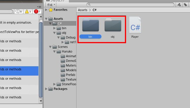 新規スクリプトを作成すると、「bin」と「obj」というフォルダが生成され、以下のようにエラーが出ることがあります。