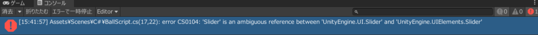 このようなエラーが出た場合、Sliderが「UnityEngine.UI.Slider」と「UnityEngine.UIElements.Slider」との間で、あいまいな参照となっています。